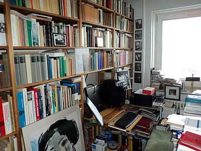 Netop sådan må Henning Vangsgaards arbejdsplads se ud, tænkte jeg straks, da jeg så de mange (tyske?) bøger overalt (men på den anden side: hvordan får han plads til de lange ben?). Og efter sidste måneds kvindelige oversætter fra provinsen vil det vel være pasende med en mandlig oversætter fra hovedstaden denne gang?
