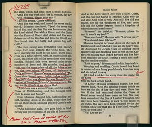 Den største fryd ved alle disse hjembragte klenodier er de kommentarer, der er blevet efterladt af tidligere ejere, og min mani med at sætte sedler ind på steder, jeg har lyst til at vende tilbage til, stammer fra engang, hvor jeg fik et eksemplar i hånden af en amerikansk roman, ’Bisbee 17’ af Robert Houston. Den blev udgivet af Socialistisk Bogklub i 1979 i en oversættelse af Mogens Boisen. Og den udgave, jeg stod med, var den udgave, Boisen havde brugt til sit arbejde. Jeg så til min udelte morskab og forundring, at Boisen havde overstreget bestemte passager med blyant – og undertiden så arrigt, at der var gået hul i papiret – og i margenen skrevet ting som ’Sludder!’ og ’Kællingevrøvl!’ Jeg morede mig endnu mere, da jeg så kunne konstatere, at de udstregede passager ikke var med i hans danske udgave.