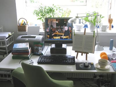 I mit hjem i Viby J i et hyggeligt, højt kælderværelse med direkte udsigt til et gammelt filippatræ, som står lige på spring og om nogle måneder giver de bedste æbler til æblekage. Jeg skal have fuldkommen ro, når jeg arbejder – ingen musik, ingen forstyrrelser, helst ingen lyde overhovedet. På skrivebordet på mit skrivebord et foto af en håndfuld oversætterkolleger/-venner uden hvem, jeg ved ikke hvad.