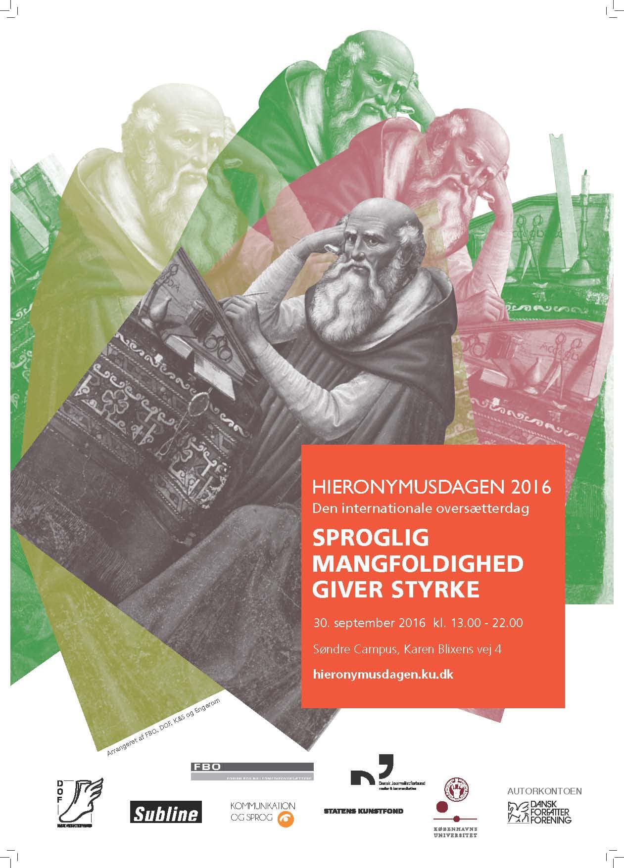 Den 30. september er det “International Translation Day” eller Hieronymusdag. Den fejres over hele Europa, og i Danmark markeres dagen bl.a. med en konference under overskriften “Sproglig mangfoldighed giver styrke!” Som svar på de mange nedskæringer på landets højere uddannelsesinstitutioner, noget der har ramt sprogfagene særlig hårdt, arrangerer Dansk Oversætterforbund, Forbundet Kommunikation & Sprog, Forum for Billedmedieoversættere og Institut for Engelsk, Germansk og Romansk på Københavns Universitet i fællesskab en dag med fokus på alt det, sprog kan, og hvorfor det er vigtigt at bevare muligheden for at forstå og blive forstået af mennesker, som ikke taler dansk eller engelsk. Det er ikke kun for at fremme dansk eksport, det er også og måske især, fordi vores verden bliver et fattigere og mere indskrænket sted, hvis vi kun kan forstå og tale med dem, som ligner os selv. Sproglig mangfoldighed er også kulturel og åndelig mangfoldighed, fordi viden om og beherskelse af sprog giver indblik i måder at tænke på, som er fremmede for det vi kender.