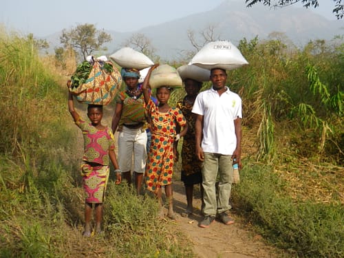 Vejen var god da vi kørte mod Makeni, hovedbyen i den landsdel hvor det meste af De der gik forud vistnok foregår – der er meget få geografiske oplysninger i bogen, for eksempel forekommer navnet Sierra Leone overhovedet ikke. Men næste morgen var det slut med den gode asfaltvej, og jordvejene vidnede om et skrabet anlægsbudget. Jeg kiggede nysgerrigt på de landsbyer vi kom igennem, og kunne genkende bogens beskrivelser af landsbyens bygninger. Hver landsby havde virkelig en barrie til at afholde møder, og de var alle sammen bygget efter samme mønster, som en overdækket veranda uden tilhørende hus.