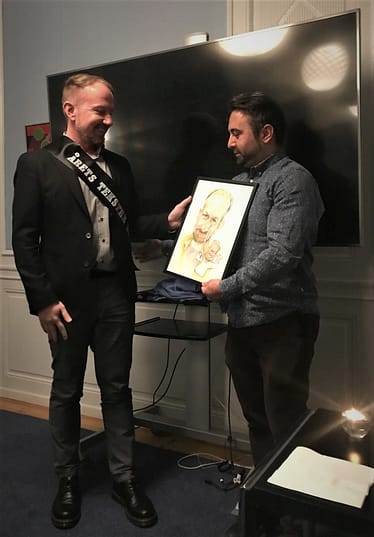 Babelfisken ønsker hjerteligt tillykke og bringer her et foto og tegningen af prisvinderen (fotograf: Christa Hejlstrup), fulgt af Peter Bjerre Rosas takketale ved overrækkelsen.