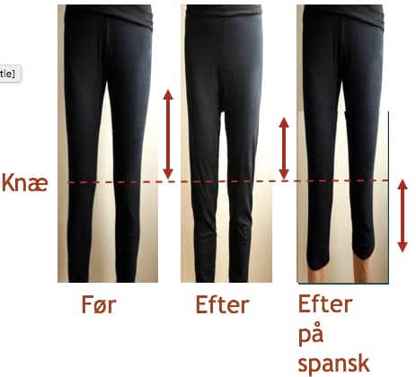 På engelsk er strømpebukserne for små, så de umuligt kan blive trukket så langt op, som det er meningen, men på spansk er de blevet til en form for stumpebukser, som Uwe Kjær Nissens illustration viser.