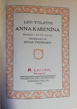 Også Tolstoj har fået en ekstra farvning visse steder, for eksempel her den berømte indledning til Anna Karenina. I Ejnar Thomassens oversættelse fra 1956 lyder den:
