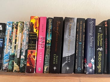Da de nævnte bøger er i Aarhus, og jeg selv er i Dronninglund, har jeg taget et billede af fantasy-hylden i min mors hus.