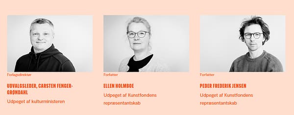 Projektstøtteudvalget for litteratur har deres anden uddelingsrunde i år og består af forlagsdirektør Carsten Fenger-Grøndahl (udvalgsleder), forfatter Elllen Holmboe og forfatter Peder Frederik Jensen.
