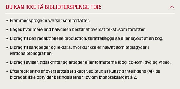 For det andet: I DOF (hvor jeg sidder i styrelsen) er vi ikke maskinstormere, og vi benytter os af masser af ny teknologi i vores arbejde, så vores initiativ har intet med hverken protektionisme eller en længsel efter forne tiders fjerpenne at gøre. Men biblioteksafgiftens grundlag er lige så klart: en støtte til udviklingen af det danske sprog, som det er skrøbeligt: Vi – og andre autorer, forfatterne og illustratorerne ikke mindst – må stå vagt om dens berettigelse, legitimitet og troværdighed, for det er så uendelig let for uvidende modstandere at foreslå dens nedlæggelse. Hvis nogen skulle begynde at argumentere imod den ved at sige, at enhver, der kan bruge ChatGPT, kan få bibliotekspenge, ville vi være ilde stedt.