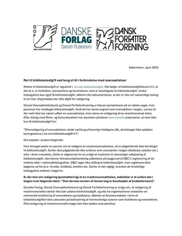 Efter henvendelse fra oversætterforbundet udsendte Slots- og Kulturstyrelsen en mindelse, som understregede de allerede eksisterende regler i lov om biblioteksafgift: at “efterredigering af maskinoversættelser skabt ved brug af kunstig intelligens” ikke er berettiget til biblioteksafgift.