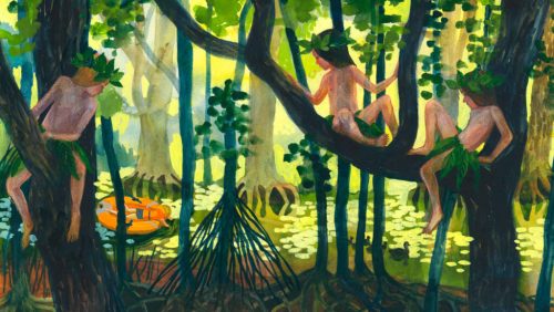 “Knap 200 ord sætter rammerne, men inden for dem flyder farver og former: hvirvlende vandfald, dansende junglebørn og lysende papegøjer. Midt i alt det vilde opstår øjeblikke af stilhed. Et barns udstrakte hånd og et frø, som skifter ejer, så det også kan komme til at gro. Det er en fantasi, som man kan skabe selv eller sammen med andre udfra de flertydige figurer, mønstre og detaljer, som indbyder til fortolkning og genlæsning. Hver side er et kunstværk!”